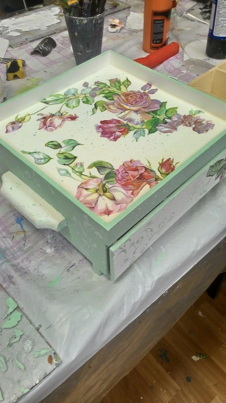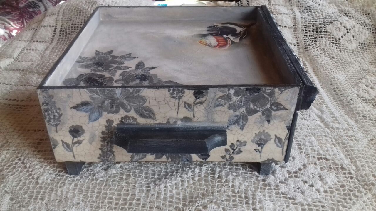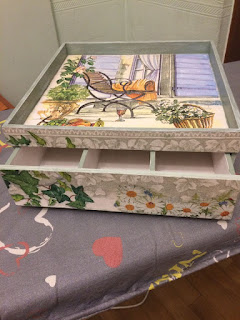 Случился у меня мастер-класс, вообщем-то, ничего необычного, два раза в неделю такое происходит))), но редко бывает, чтобы все сделали совершенно разные работы. Тем более, что заготовка большая, это столик-поднос с выдвижным ящиком впереди.. Некоторые фото сделаны в процессе работы, другие уже после окончательной отделки, почти на всех еще нет ручек на переднем ящике, но это дело наживное). Хвалюсь)))